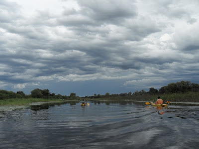 Dans le delta, encore une fois, nos expériences ont été plus qu’originales. Alors que nous désespérions en regardant les prix des tours opérateurs pour visiter la zone humide, nous sommes tombés sur Sarah-Lee, une infirmière motswana blanche qui nous a fait partager son amour de la nature : un cottage au milieu des arbres envahis par les araignées, serpents et toute sorte d’autres bestiaux que nous avons pour habitude de fuir en Europe. Eh bien, nous avons appris à vivre avec. Deux jours plus tard, nous voilà à bord de kayaks à pagayer entre les roseaux, provoquer des envolées d’aigrettes, de jacanas et d’openbill stocks (grands oiseaux noirs avec un bec en forme de casse-noix pour déguster les crustacés). Lorsque Sarah-Lee me fait un signe de la main en poussant mon kayak jaune à l’eau, ses derniers mots, empruntés d’un air extrêmement sérieux, sont : « If you see a hippo, don’t get close to it and concerning crocodiles, they usually don’t approach us. » (« Si tu vois un hippopotame, ne t’approche pas trop près et concernant les crocodiles, ils ne viennent généralement pas des humains »). Ce jour là, hormis des oiseaux, nous n’avons vu que des paysages magnifiques, admiré la corolle des nénuphars se retournant au souffle du vent, pagayé entre les herbes hautes et avancé au doux son de la nature, droit vers le soleil couchant.